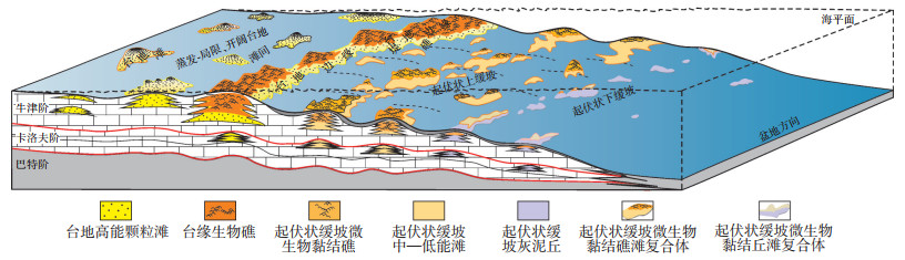 4 结论(1)阿姆河盆地东部中侏罗统卡洛夫阶、上侏罗统牛津阶灰岩层,与下侏罗统海陆过渡煤系层、上侏罗巨厚膏盐岩层形成了一套区域性优质的生储盖组合,具有丰富的油气资源和勘探开发潜力。牛津期继承卡洛夫期沉积相带分异,坚基兹库尔隆起及以西区域发育碳酸盐岩台地;以东区域为地势平缓、相带分布宽(约8 000 km2)的起伏状缓坡,广泛发育了微生物黏结丘/礁/滩、丘滩或礁滩复合体及微生物黏结丘微相。