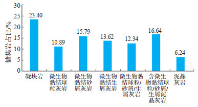 2.4 储层物性与储层类型研究区不同储集岩类物性如表 1所列,根据碳酸盐岩储层划分标准[12],最好的是凝块岩,为Ⅱ类储层;其次是微生物黏结球粒/砂屑/生物等颗粒灰岩为Ⅲ类储层;受构造与溶蚀改造后的(含)微生物黏结球粒/砂屑/生物等颗粒泥晶灰岩及泥晶灰岩为Ⅳ类储层。