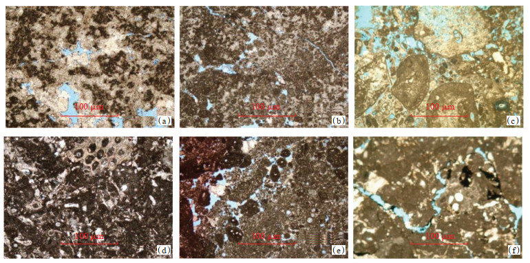 下载原图 图 5 阿姆河盆地东部牛津阶微生物储集岩岩石学特征 (a)凝块岩,Sh-21井,ⅩⅤhp,3 605.10 m,铸体薄片(+);(b)微生物黏结球粒颗粒灰岩,Sh-21井,ⅩⅤhp,3 598.93 m,铸体薄片(+);(c)微生物黏结微—亮晶砂屑生物屑灰岩,苔藓虫、棘皮、腕足。Pi-21井,ⅩⅤhp,3 158.61 m,铸体薄片(+);(d)微生物黏结生屑微晶灰岩,苔藓虫、棘皮、腕足,少量海绵骨针和介壳等,Cha-22井,ⅩⅤhp,3 533.06 m,普通薄片(-);(e)微生物黏结球粒/砂屑/生屑灰岩,Sh-21井,ⅩⅤhp,3 603.3 m,铸体薄片(+);(f)含微生物黏结生屑泥晶灰岩,压溶缝合线充填沥青,海绵骨针、有孔虫、海百合、腕足和介壳,Pi-21井,ⅩⅤhp,3 186.82 m,铸体薄片(+) Fig. 5 Petrological characteristics of Oxfordian microbial reservoir rocks in eastern Amu Darya Basin |
