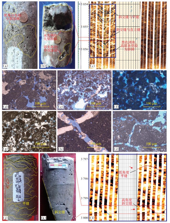 2.3.3 微裂缝研究区储集岩中微裂缝按成因可分为构造破裂微缝、成岩溶蚀微缝两类。构造破裂微缝在岩样上总体发育程度一般,岩心描述与成像测井资料综合反映是以斜交微缝与直立微缝为主[图 6(c),(k),(l)]。显微镜下见构造破裂微缝平直切割生物屑、砂屑、球粒等[图 6(h)],微缝内由粗晶方解石等半充填。成岩溶蚀微缝受岩石结构差异性控制,显微镜下见颗粒间微缝呈断续状、充填程度低[图 6(i)];在岩样上为“发丝状”呈网络结构分布[图 6(j)],成像测井上反映出低角度高阻带的特征[图 6(l)]。这些微裂缝既连通孔、洞,局部又被溶蚀扩大作为储集空间。