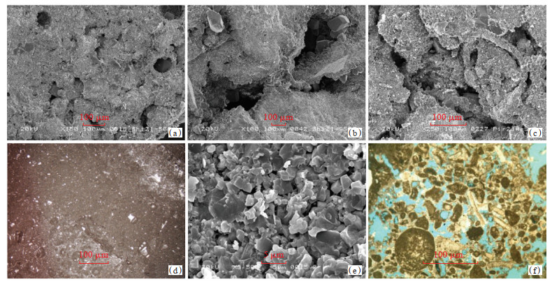 下载原图 图 7 阿姆河盆地东部牛津阶微生物储集岩黏结结构特征 (a)深灰色微生物黏结砂屑颗粒灰岩,砂屑颗粒结构疏松,颗粒间孔隙发育,Ch-22井,3 519.33 m;(b)含微生物黏结生屑颗粒灰岩,颗粒间结构疏松,粒间孔发育好,Sh-21井,3 574.15 m;(c)微生物黏结生物屑砾屑砂屑颗粒灰岩,岩石局部呈团粒状颗粒,结构疏松,溶孔发育,且连通,Pe-22井,3 249.87 m;(d)含球粒颗粒泥晶灰岩,Ssh-21井,3 992.70 m,普通薄片(-);(e)图d扫描电镜照片,方解石晶体之间呈镶嵌状、点状、港湾状接触,晶间微孔隙较发育,Ssh-21井,3 992.70 m;(f)微生物黏结生物屑砂屑颗粒灰岩,颗粒具有等厚环边方解石胶结特征,Pi-21井,ⅩⅤhp,3 158.61 m,铸体薄片(+) Fig. 7 Microbial bonding structure characteristics of Oxfordian microbial reservoir rocks in eastern Amu Darya Basin |