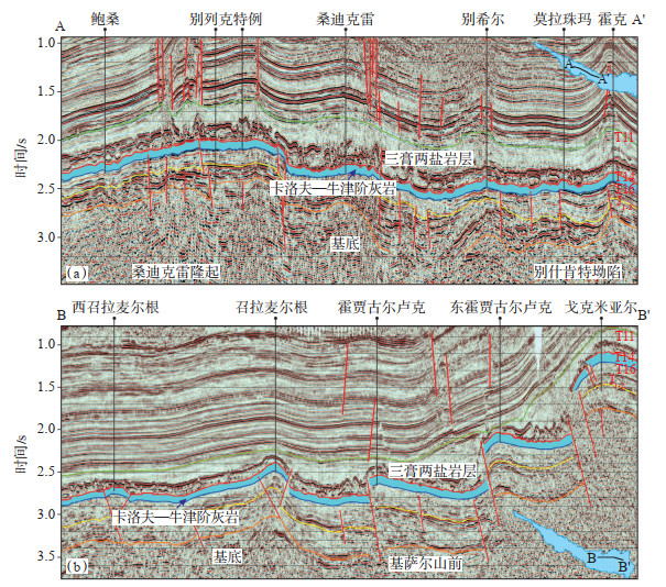 下载原图 图 8 阿姆河盆地东部桑迪克雷隆起—别什肯特拗陷—基萨尔山前带构造地震剖面 Fig. 8 Seismic sections of the Sandy Klei Uplift - Beishkent Depression-Kisar Piedmomt Belt in eastern Amu Darya Basin |