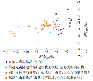 下载原图 图 9 阿姆河盆地东部全岩与次生矿物的δ13C-δ18O特征 Fig. 9 δ13C-δ18O characteristics of total rock and secondary minerals in eastern Amu Darya Basin |