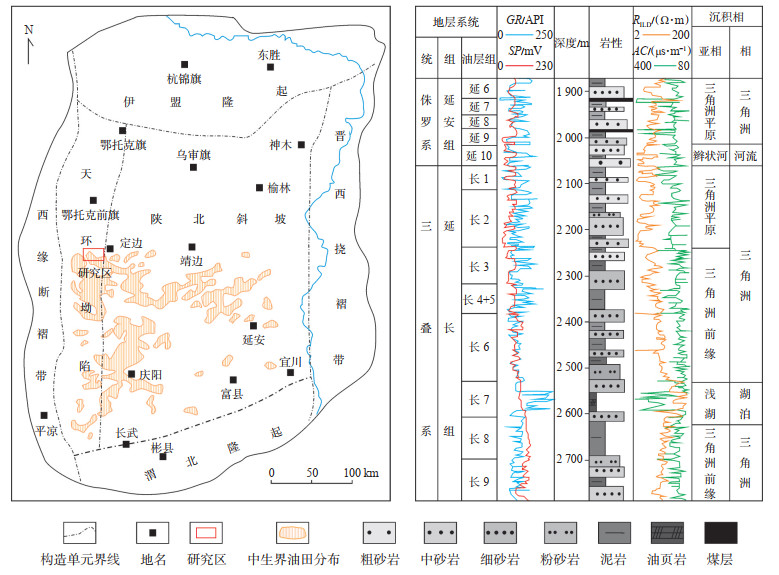 1 地质概况定边油田沙涧区位于鄂尔多斯盆地的天环坳陷东部[图 1(a)], 邻近陕北斜坡, 隶属于陕西省榆林市定边县西南部的红柳沟镇, 工区面积120 km2。三叠系延长组和侏罗系延安组沉积时期, 鄂尔多斯盆地为大型的陆相坳陷盆地, 内部构造相对简单, “相-势”耦合控制石油聚集[19], 以岩性油藏为主。同时, 在低幅度构造的影响下, 局部亦发育构造-岩性油藏[20]。沙涧区延长组以灰绿色、灰色中细-粉砂岩夹暗色泥岩为主, 从上到下可进一步划分为10个油层组(长1-长10)。而延安组总体以浅灰色细- 中砂岩及少量粗砂岩夹深灰色泥岩、煤层为主, 亦可划分10个油层组(延1-延10)。其中延安组的延9油层组和延长组的长6及长9油层组为定边油田的主力产油层。
