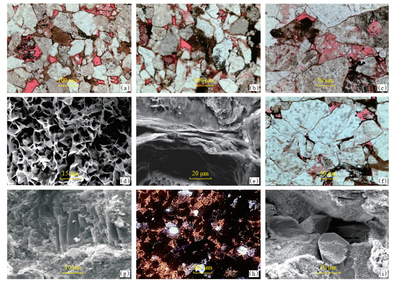 下载原图 图 2 鄂尔多斯盆地定边油田沙涧区主力油层组砂岩储层显微照片 (a)绿泥石黏土薄膜形成残余粒间孔, 部分颗粒溶蚀成溶蚀粒间孔, D3268井, 1 925.08 m, 延9, 单偏光;(b)绿泥石薄膜发育, 保留了部分粒间孔, D3735井, 2 525.54 m, 长6, 单偏光;(c)溶蚀作用发育, 长石颗粒沿解理溶蚀, 岩屑易溶组分溶蚀强烈, D3831, 2 498.63 m, 长9, 单偏光;(d)伊蒙混层充填孔隙, D13井, 2 837.05 m, 长9, 扫描电镜;(e)颗粒紧密接触, 云母弯曲变形, D3251井, 2 422.5 m, 长6, 电镜扫描;(f)压实作用强烈, 颗粒长线-凹凸接触, 泥质成假杂基充填孔隙, 资D3268井, 2 645.53 m, 长9, 单偏光;(g)方解石致密胶结, D3251井, 2 700.35 m, 长9, 扫描电镜;(h)石英发棕褐色光, 长石主要发亮蓝色、土黄色光, 蚀变较普遍, 方解石胶结非常发育, 发明亮橙黄色光, D44080井, 2 768.09 m, 长9, 阴极发光;(i)绿泥石、硅质胶结, 堵塞吼道, 发育残余粒间孔, D3269井, 2 391.15 m, 长6, 扫描电镜 Fig. 2 Micrographs of sandstone reservoirs ofmain oil reservoirs inShajian area of Dingbian Oilfield, Ordos Basin |