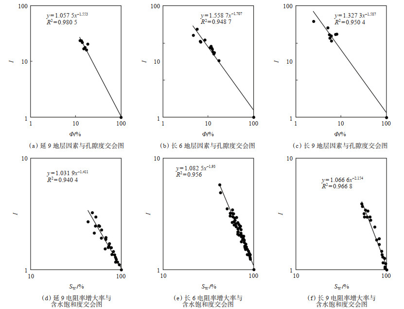 分别建立各油层组的地层因素(F)和孔隙度(Φ)、电阻率增大率(I)和含水饱和度(Sw)的关系图版(图 3), 然后根据地层水分析和地层温度资料, 确定等效NaCl溶液矿化度和地层水电阻率(Rw), 以此可确定阿尔奇公式计算含油饱和度各参数值(表 3)。