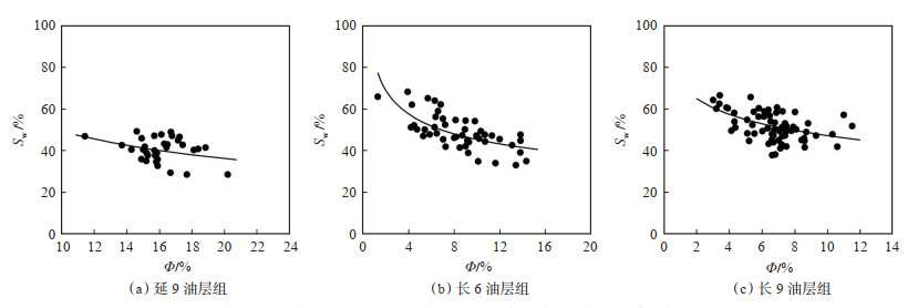 对延9、长6和长9油层组密闭取心油层段测定的孔隙度(Φ)与含水饱和度(Sw)进行交会, 拟合成孔隙度与含水饱和度关系曲线(图 4)。油层的现场损失含水一般为3%~5%(由于本次密闭取心井岩心出筒后及时进行了实验分析, 所以按3% 进行校正), 最后可确定各油层组密闭取心法含油饱和度值。