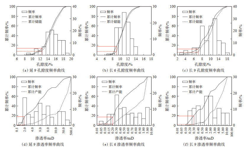 同理, 当长6孔隙度(Φ)下限值取9.0%时[图 5 (b)], 累计储油能力丢失8.04%, 相应渗透率(K)为0.2 mD[图 6(b)], 当渗透率下限值取0.2 mD时, 累积产油能力丢失3.04%[图 5(e)], 因此孔隙度9.0%、渗透率0.2 mD可以作为长6有效厚度物性下限。当长9孔隙度(Φ)下限值为7.0% 时[图 5(c)], 累计储油能力丢失7.16%, 相应渗透率(K)为0.30 mD [图 6(c)], 当渗透率下限值取0.30 mD时[图 5(f)], 累积产油能力丢失2.12%, 因此孔隙度7.0%、渗透率0.3 mD可以作为长9有效厚度物性下限。