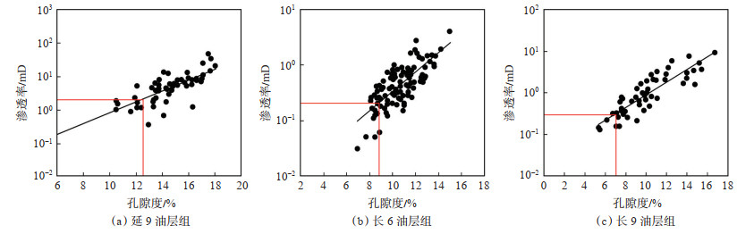 从定边油田沙涧区延9、长6和长9油层组有效厚度物性下限的分析结果来看, 各层平均埋藏深度与孔隙度下限值呈负相关, 但渗透率下限由高到低呈现的趋势为延9、长9、长6。该区中生界储层中初始孔隙度相差较小[25], 但由于各层沉积环境不同, 各储层的埋深、岩石组分及产状、地层温压等存在较大差异, 使得后期不同成岩作用对各储层物性变化的影响程度差别较大。