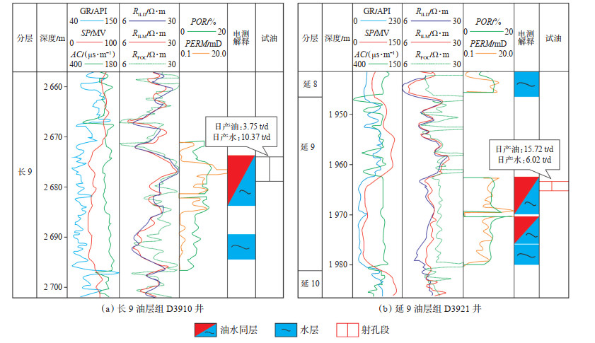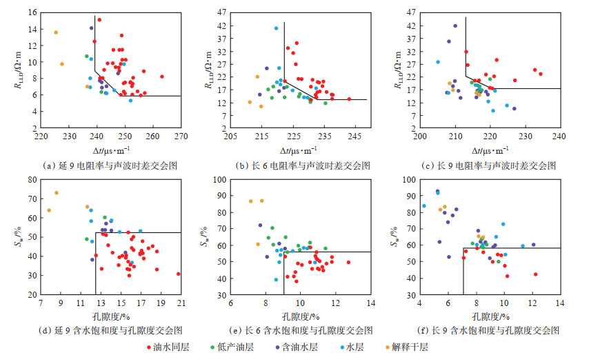 利用延9(48口井52层)、长6(39口井52层)和长9油层组(44口井45层)的试油试采资料点, 分别建立延9、长6和长9油层组的声波时差(Δt)与深感应电阻率(RILD)、孔隙度(Φ)与含水饱和度(Sw) 的两两交会图版, 图版精度均大于94%(图 7)。对于混入油层(油水同层)分布区的水层(含油水层), 分析其原因主要是由于射孔弹强度低、射孔位置不合理及压裂加砂规模偏小等工程原因导致解释油层(油水同层)试油未取得理想效果。