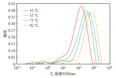 图 1为准噶尔盆地玛湖凹陷二叠系下乌尔禾组砾岩储层在不同温度下测量的原油样品核磁共振T2谱,在地层温度条件下(92 ℃),原油的核磁共振T2谱为100.00~3 000.00 ms,随着温度降低,原油黏度增大,原油自由弛豫范围不断向短T2时间移动。