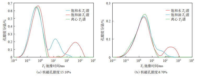 润湿性分析显示下乌尔禾组储层岩石以水润湿为主(表 2),因此岩心饱和水T2谱主要为水的表面弛豫,而饱含油岩心T2谱则存在表面弛豫和自由弛豫。在地层温度条件下,通过核磁共振实验分别获得了岩心离心T2谱、饱和水T2谱和饱和油T2谱。如图 2所示,将2块不同物性的岩心在不同饱和状态下的核磁共振T2谱进行对比,可知由于离心、饱和油、饱和水岩石都保留了岩石的黏土束缚水部分,因此三者在黏土弛豫时间范围内基本重合,2块样品的黏土弛豫时间分别为0.01~4.00 ms和0.01~ 10.00 ms。离心谱和饱和水T2谱对比表明,可动水表面弛豫谱主要集中在中等弛豫时间内,分别为4.00~100.00 ms和15.00~100.00 ms。当岩心饱和油时,可动水表面弛豫孔隙度分量明显减小,大弛豫时间孔隙度分量则明显增大,其主体部分为100.00~2 000.00 ms,与原油样品自由弛豫时间范围相吻合,这表明岩石中的油信号应为自由弛豫,其分布范围大于100.00 ms。