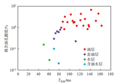 Φ100与T2LM的物理意义为:①核磁共振测井反映地层孔隙度的变化,而100.00 ms后孔隙度表征含油孔隙度的变化;②几何平均值可以表征T2谱形的位置,储层含油性越好、油的自由弛豫信号越强,几何平均值越大,反之则小。同时,由于砾岩可动流体T2弛豫时间起始于10.00 ms[30],且实测核磁共振测井T2谱2 000.00 ms后大多为噪音信号,所以视含油孔隙度与T2几何平均值均选取10.00~2 000.00 ms。利用这2个敏感参数绘制核磁流体性质识别图版(图 3),可知,油层的Φ100与T2LM值大,交会点位于图版右上方,而水层的Φ100与T2LM值较小,交会点位于图版的左下方。