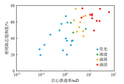 从岩心渗透率与密闭取心饱和度交会图(图 5) 可知,岩性渗透性越好,含油级别越高。渗透率对含油性具有一定的控制作用。