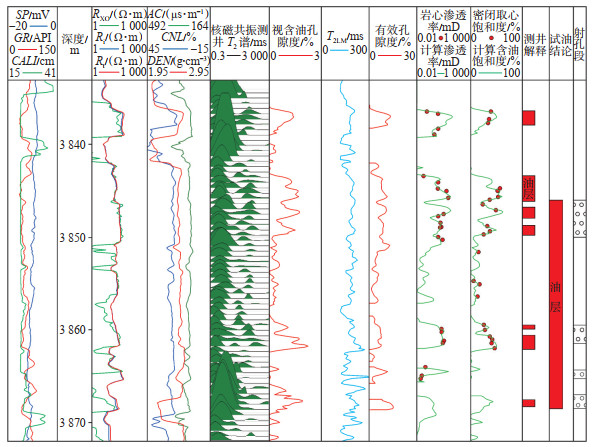 图 6为玛湖凹陷A井二叠系下乌尔禾组砾岩储层的核磁共振测井含油性评价成果图。3 842.0~ 3 850.5 m,3 859.0~3 862.0 m,3 867.0~3 868.5 m微球聚焦电阻率与深浅侧向电阻率数值基本无差异,可认为泥浆无侵入,冲洗带残余油饱和度较高,核磁含油信号较明显。3 836.0~3 839.0 m,3 867.0~ 3 868.5 m微球聚焦电阻率与深浅侧向电阻率值有一定的差异,但核磁100.00 ms后原油的自由弛豫信号依旧明显,说明泥浆侵入较浅。利用本文方法对上述层段进行含油性评价,可知:计算的视含油孔隙度平均值为1.15%,T2LM平均值为102.00 ms,位于流体性质识别图版的油层区域,定性解释为油层;储层的有效孔隙度平均值为7.70%,渗透率平均值为2.33 mD,利用式(5)计算的含油饱和度与密闭取心饱和度吻合较好。根据目的层解释经验,油层的有效孔隙度下限为5.80%,饱和度下限为50%,对3 846.0~3 868.5 m层段进行试油,解释为油层,日产油8.7 t/d。
