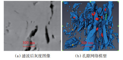 利用Avizo 9.1软件,根据FIB-SEM扫描的泥页岩切片图像,进行泥页岩微观孔隙结构的三维重建。通过扫描的岩心切片图像,首先选取孔隙集中发育的区域进行分割,以降低计算和重建的时间,岩心网格尺寸为220×220×220,真实尺寸为2.2× 2.2×2.2 μm,然后将扫描的切片图像进行降噪处理,再利用高斯滤波方法对图像进行滤波,以消除噪声,提高图像信噪比[15][图 1(a)]。滤波处理后的图像不仅保留了原始孔隙和喉道的基本形态和完整性,而且剔除了影响后续三维重构的噪声点。孔隙和骨架具有不同的灰度值,孔隙空间具有高灰度值,而岩石骨架的灰度值较低,利用手动阈值法调整孔隙的阈值,对滤波后的图像进行孔隙的提取与分割,进而获得孔隙和岩石骨架的三维模型[图 1(b)]。