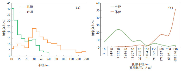 由于FIB-SEM对扫描样品的尺寸的限制,将高压压汞数据中微米级大孔隙数据剔除,将孔隙结构特征与高压压汞实验数据(表 3)进行比较,以验证建立的孔隙网络模型孔隙结构的正确性。