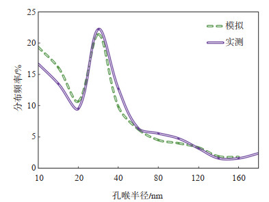 下载原图 图 3 模拟孔喉半径与实测孔隙和喉道半径分布对比 Fig. 3 Comparison of simulated and measured pore and throat radius distribution |