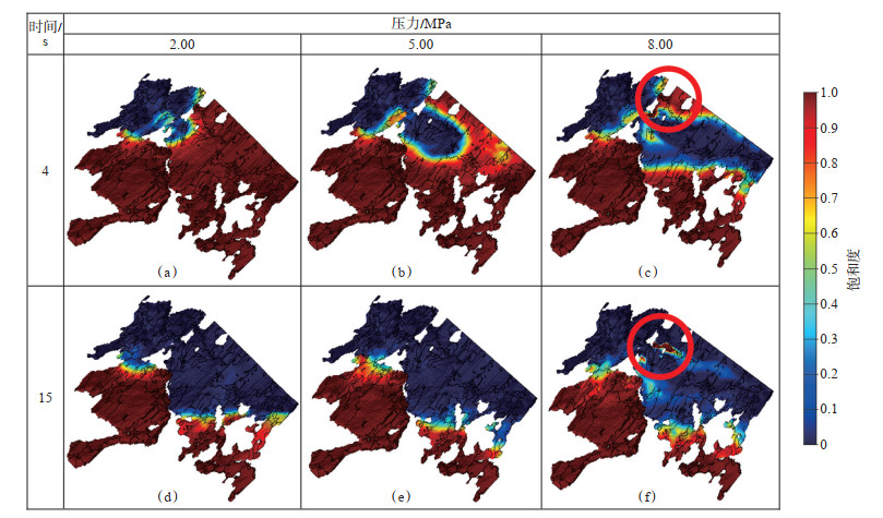 图 5为不同驱替压力下第4 s和第15 s时饱和油分布图,在相同时刻,随驱替压力的增加,含油饱和度逐渐降低。当饱和油经过狭窄喉道,由于压力梯度的增加,流体速度增加较快,出现指进现象,在喉道附近形成剩余油,剩余油沿着流动方向以条带状分布[如图 5(c),(f)中红色圆圈所示]。