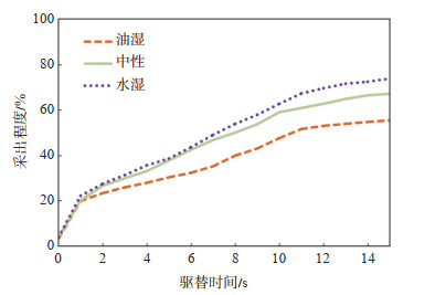 下载原图 图 6 不同润湿性下采出程度变化曲线 Fig. 6 Variation curves of recovery degree under different wettability |