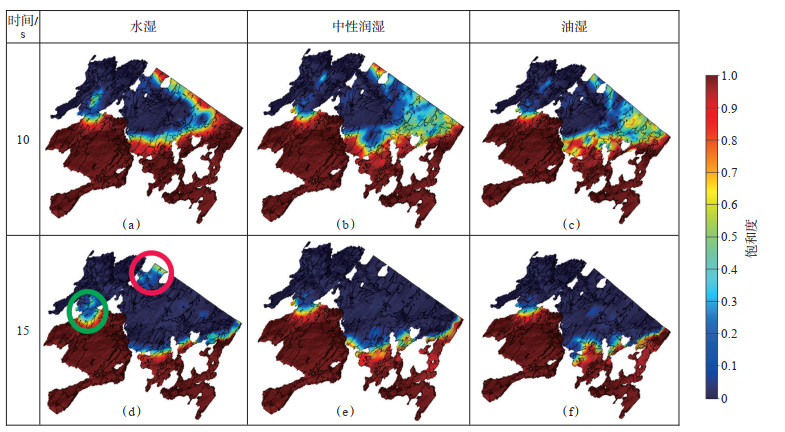 图 7为第10 s和第15 s(驱替稳定后)不同壁面润湿下剩余油的分布情况,模型内剩余油分布壁面水湿高于中性高于油湿。在壁面为水湿的情况下,当水相驱替油相时,毛管力为动力,推动水相前进,一旦水相通道形成,水相主要沿着流动方向前进,向四周方向波及力量减弱。与中性及油湿相比,更易在拐角处形成剩余油[如图 7(d)中红色圆圈所示]。相比于水湿和油湿的情况,当壁面为中性润湿时,水相均匀的向四周推进,波及面积最大,且不易形成剩余油。因此,润湿性对于泥页岩储层的采出程度具有重要影响,水湿模型采出程度最高,而中性润湿模型及油湿模型不易形成剩余油。