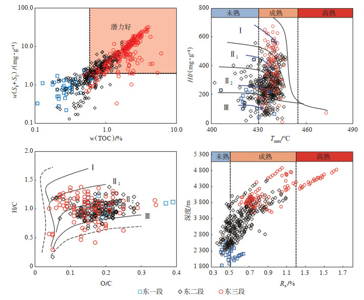 有机质丰度、类型、成熟度是评价烃源岩质量最基本的参数,决定烃源岩的产烃基础[22]。此次研究采用行业标准评价体系,利用总有机碳(TOC)含量、热解生烃潜量(Pg)、氢指数(HI)、碳氢氧原子比(H/C,O/C)、镜质体反射率(Ro)和热解峰温(Tmax)综合评价烃源岩品质(图 2)。渤中凹陷东营组干酪根类型整体上以Ⅱ1—Ⅱ2为主,东三段和东二段下部泥岩均是良好的烃源岩,并进入了成熟阶段,向上到东二段上部和东一段逐渐变差,且处在未熟—低熟阶段。