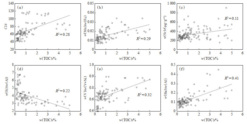 4.5 古氧化还原条件分析氧化还原条件对于有机质的保存具有十分重要的影响。水体中的氧化还原条件控制着部分元素的含量变化,例如V,U,Ni,Th等敏感元素便是用于反映水体氧化还原条件的常用参数[38, 41]。前人研究普遍认为w(V)/w(V + Ni)> 0.72,w(U)/w(Th)>0.25反映还原水体,反之则表现氧化环境[7, 42]。同时Pr/Ph(姥鲛烷/植烷)也是反映水体氧化还原条件的重要指标之一,其值越小还原性越强[43]。本文采用V(/ V + Ni),U/Th和Pr/Ph作为氧化还原环境的判别指标(图 3)。结果表明,东三段w(V)/w(V+Ni),w(U)/w(Th),w(Pr)/w(Ph)平均值分别为0.77,0.28,0.97,比值中等,表现为弱还原环境,而东二段与东一段w(V)/w(V + Ni),w(U)/w(Th)值偏低、w(Pr)/w(Ph)值较高,平均值分别为0.72,0.2,1.79和0.63,0.18,2.4,表现为偏氧化环境。TOC含量与V(/ V+Ni)比值呈现明显的正相关,表明还原环境利于渤中凹陷东营组有机质的富集和保存[图 4(e)]。