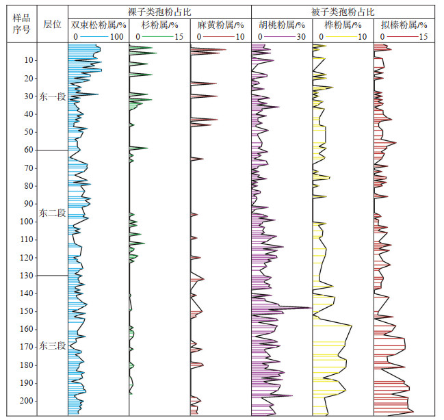 古生物孢粉中裸子类和被子类的含量变化可以判断古气候特征[27-28]。渤中凹陷东营组下部孢粉中温湿条件的代表胡桃粉属、桦粉属、拟榛粉属数量占比明显增多,占总孢粉数的20.6%;上部孢粉中干旱条件的代表麻黄粉属、杉粉属、双束松粉属数量占比明显增多,占总孢粉数的33.5%(图 5),表明东营组下部气候较上部更为温湿,其生物种属含量上的反映与元素比较结果相一致。