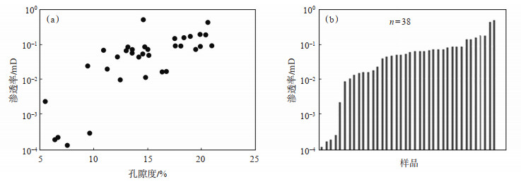1 孔隙结构特征及因素 1.1 低渗透砂岩物性特征低渗透砂岩储层物性参数是其储集能力及渗流能力的反映[15],其中孔隙度和渗透率是评价储集层品质的重要参数。孔隙度反映岩石储集空间的多少,渗透率则反映储集层孔隙空间的连通性和渗流能力[16]。从东营凹陷南坡F154区块4口井古近系沙河街组沙三段38个样品的孔隙度与渗透率分布关系[图 1(a)]可知,孔渗分布范围广;从在压力为3.00 MPa下的覆压渗透率分布[图 1(b)]可知,0.000 1~1.000 0 mD均有分布,主要为0.010 0~0.100 0 mD,该区低渗透砂岩孔隙结构的复杂性。
