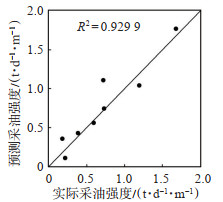 4.2 产能预测模型实际应用及检验将建立的产能预测模型应用于4口井中的8个层段,计算出各层段的预测采油强度(表 6),实际采油强度与预测的采油强度相关性较好,绝对误差低于0.380 t/(d·m),表明预测采油强度与实际采油强度比较接近(图 11),预测效果较好。