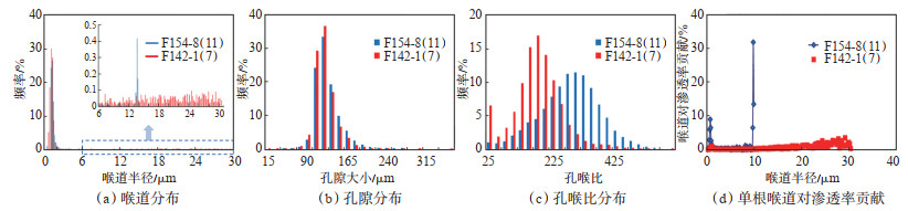选取研究区内孔隙度相差不大,但渗透率相差较大的2块样品:F142-1(7)(孔隙度20.58%,渗透率0.439 8 mD)和F154-8(11)(孔隙度18.12%,渗透率0.089 5 mD),利用恒速压汞参数开展定量化分析(表 1),可知:①二者喉道半径集中分布在1.00 μm左右,但F142-1(7)喉道半径大于1.00 μm的喉道占比19.41%,而F154-8(11)喉道半径大于1.00 μm的喉道占比仅为5.26 %,且F142-1(7)存在喉道半径超过14.00 μm且占比达3.93% 的喉道[图 2(a)]。②二者孔隙大小均集中分布且大小相近[图 2(b)]。③ F142-1(7)孔喉比小,而F154-8(11)孔喉比偏大,F142-1(7)的孔隙结构优于F154-8(11)[图 2(c)]。④ F142-1(7)大于14.00 μm的喉道占比较大,对渗透率的贡献也大,而F154-8(11)渗透率的主要贡献者是2处喉道半径较小处,大喉道(大于14.00 μm)对渗透率反而几乎无贡献[图 2(d)]。综合分析表明大喉道及大喉道占比多对渗透率有着重要的控制作用。