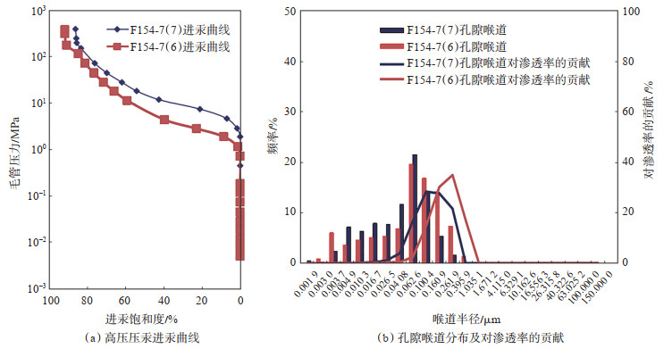 从高压压汞实验角度出发,分析孔隙度相差不大而渗透率相差较大样品:F154-7(6)(孔隙度17.52%,渗透率0.142 0 mD)和F154-7(7)(孔隙度9.65%,渗透率0.000 3 mD),利用高压压汞参数上的差异性,进一步分析微观孔隙结构参数对渗透率的影响(参见表 1),可知:①高压压汞参数存在区别,F154-7(6)排驱压力及饱和中值压力均小于F154-7(7),平均孔喉半径大于F154-7(7)。② 2块样品的进汞曲线形态相似,F154-7(6)曲线整体上处于F154-7(7)曲线之下,且向左下方凸出,前者排驱压力较低、进汞饱和度较高[图 3(a)],代表歪度比后者更粗,即F 154-7(6)孔隙喉道分布频率众数偏于粗孔隙端。③ F154-7(6)的喉道半径总体上比F154-7(7)喉道半径大,且大喉道更多,大于0.16 μm的大喉道数量明显更高;当喉道半径大于0.16 μm时,对F154-7(7)渗透率的贡献开始下降,而对F154-7(6)渗透率的贡献仍然上升,这说明F154-7(6)渗透率大主要是喉道半径大于0.16 μm的喉道的贡献[图 3(b)]。