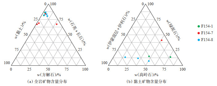 下载原图 图 4 东营凹陷南坡F154区块3口井Es3储层低渗透砂岩矿物含量分布 Fig. 4 Mineral content distribution of low permeability sandstone of Es3 reservoir of three wells in F154 block, south slope of Dongying Sag |