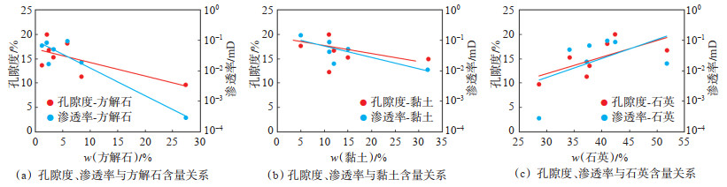 不同矿物的理化性质不同,对岩石的微观孔隙、喉道及宏观孔隙度、渗透率等会产生一定的影响,从而对岩石的孔隙结构有控制作用。对研究区内3口井Es3储层共7个样品进行相关性分析得知:孔隙度和渗透率均与方解石、黏土含量成负相关关系,而与石英含量成正相关关系(图 5)。