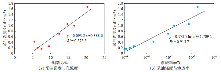 2.1 孔隙结构参数与产能关系通过整理研究区4口井生产层段数据和相应的孔隙度和渗透率(表 2),分析与采油强度间的关系,结果表明孔隙度、渗透率都与采油强度有明显的正相关关系,渗透率与采油强度相关系数更高,一定程度上说明渗透率对产能的影响作用更明显(图 7)。