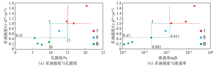 下载原图 图 7 东营凹陷南坡F154区块Es3储层采油强度与孔隙结构参数的关系 Fig. 7 Relationships of oil production intensity with porosity and permeability of Es3 reservoir in block F154, south slope of Dongying Sag |