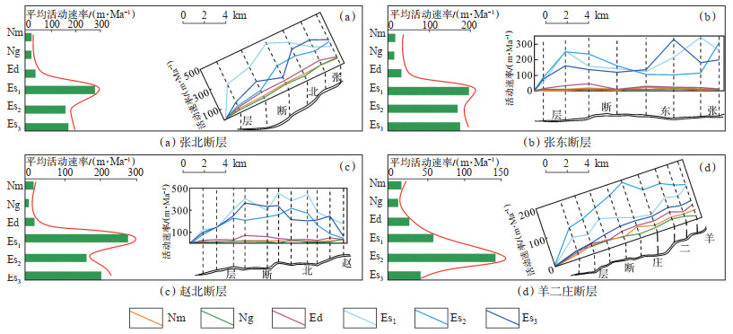 统计不同断层不同时期内的活动平均速率(表 2)可以得出,张北、张东、赵北3条主干断层ES3期—Es2期活动性减弱,Es2期—Es1期活动性增强达到最大值,Es1期—Ng期活动性持续减弱至最小值,在Nm期活动性再增强,但活动性增幅不大;羊二庄断层在Es2期活动性达到最大值,之后持续减弱,到Ng期达到最小值,Nm期活动性小幅度增强。