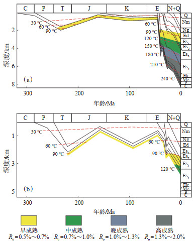 目前,歧口凹陷上古生界烃演化研究主要集中在隆起区,负向构造单元由于地层埋深大、钻井资料缺乏,上古生界生烃演化研究较少。在其他学者对歧口凹陷和渤海湾盆地沉降史研究[37-38]的基础上,结合地震资料及钻井资料,采用沉积速率法恢复剥蚀厚度[39],并利用petro mod软件模拟歧口主凹(图 4a)和埕北断阶带(图 4b)的埋藏史,进而分析歧口主凹和埕北断阶带的生烃特性。