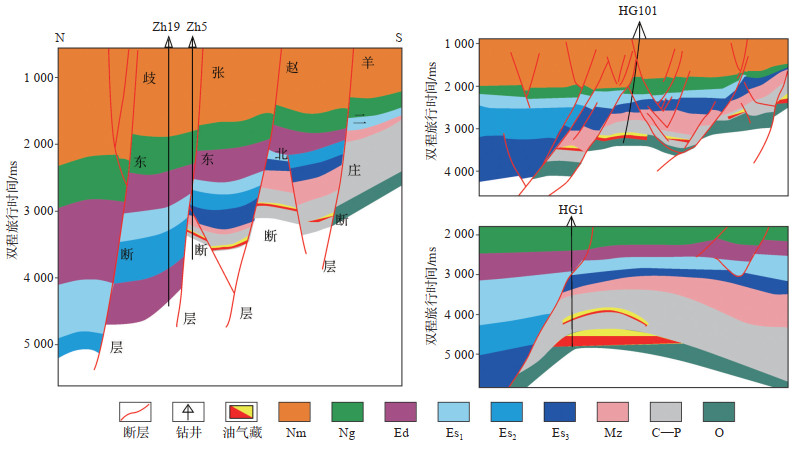 依据钻遇油气井资料(图 5),埕北断阶带的油气藏主要为自生自储的背斜油气藏、自生自储的断块-断鼻油气藏和新生古储的古潜山油气藏,其中,背斜油气藏和断块-断鼻油气藏在全区均有分布,而赵北潜山和羊二庄潜山的峰峰组灰岩的孔裂隙发育较差,油气难以储存[45],故古潜山油气藏分布在张东潜山。背斜主要形成于印支期—燕山期末,由于挤压应力的作用,埕北断阶带内形成大量的背斜、推覆叠瓦等构造样式[29-30],断块-断鼻形成于Es期,受伸展应力的影响,各主干断层的活动剧烈,切割原有的背斜构造,形成断块-断鼻构造样式。