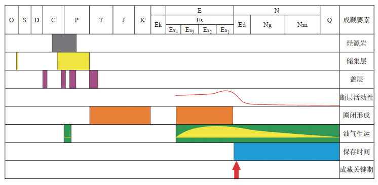 依据埕北断阶带油气事件图(图 6),上古生界烃源岩在印支期末进入生烃门限,但该次生烃强度低,不具备形成大规模油气藏的潜力;中生代,埕北断阶带沉积的泥岩与下伏的石炭系—二叠系之间形成了良好的储盖组合;Es3—Es1期,歧口凹陷各负向构造单元的上古生界烃源岩达到了生烃高峰期,主干断层伸展活动强烈,将研究区切割为由北向南逐级抬升的断阶结构,各生烃中心的生成油气可运移至奥陶系和上古生界之中,但该时期断层封堵性较差,不利于油气的保存;Ed期,主干断层活动性减弱,张北断层和羊二庄断层的封堵性分别为好和较好,张东和赵北断层的封堵性差,歧南次凹和歧北次凹生成的油气无法运移至研究区成藏,该时期的油气来源为歧口主凹和埕北断阶带,生成的油气运移至赵东潜山和羊二庄潜山成藏;Ng期—现今,为上古生界烃源岩二次生烃成藏的主要关键时期,除张北断层的封堵性较差外,其余均较好—很好,且上古生界烃源岩处于持续生烃阶段。因此,Ed期—现今,研究区内各成藏要素匹配极好。