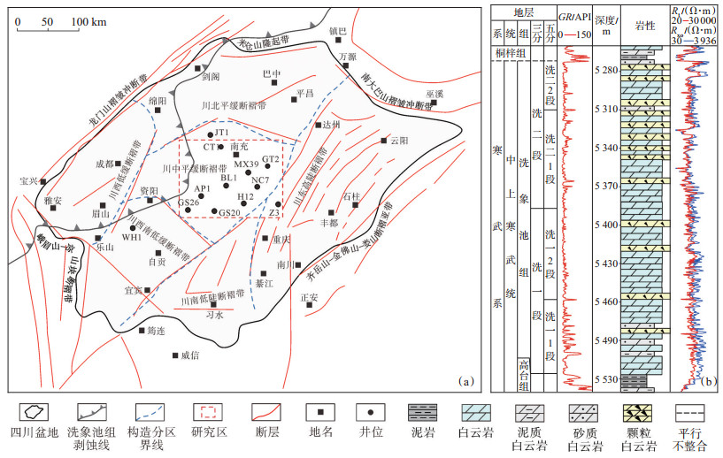 1 地质概况四川盆地是扬子准地台的一个次级构造单元,可进一步划分为6个构造分区(图 1a),研究区位于四川盆地中部,属于川中古隆起平缓构造区,位于乐山-龙女寺古隆起东南部。受乐山-龙女寺同沉积古隆起的影响[24],川中地区洗象池组地层普遍遭受剥蚀,顶部洗三段缺失,与上覆奥陶系呈不整合接触,地层厚度介于0~400 m,表现为由北西向东南增厚的趋势;结合岩性和电性特征,川中地区洗象池组地层可细分为洗一1段、洗一2段、洗二1段和洗二2段(图 1b)。洗象池组沉积期,四川盆地基本继承了龙王庙期和高台期的古地理格局,总体具有西陆东海的沉积背景[25],为镶边台地沉积,自西向东依次发育混积潮坪、云坪、台地、台地边缘和斜坡-盆地[5],其中川中地区洗象池组为局限台地沉积,可划分为台坪和颗粒滩等亚相[17, 26]。洗象池期,四川盆地处于一个海侵-海退旋回背景下,在合川-广安与南川-石柱一带古地貌高部位颗粒滩发育[5],与龙王庙期同为四川盆地寒武纪台地滩相储集体发育的关键时期[3, 27]。洗象池组白云岩先后经历了包括郁南运动、都匀运动和广西运动等多期构造抬升运动[28-29],为岩溶储层和构造裂缝的发育创造了条件。