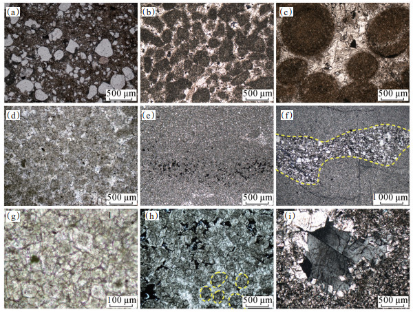 下载原图 图 2 川中地区寒武系洗象池组白云岩镜下特征 (a)陆屑黏土岩,GS26,4 323.30 m,单偏光;(b)砂屑白云岩,GT2,5 348.20 m,单偏光;(c)鲕粒白云岩,见两世代胶结,第一世代为纤状胶结,第二世代为粉晶粒状胶结,WH1,2 309.20 m,单偏光;(d)残余砂屑白云岩,颗粒结构受重结晶作用破坏,BL1,4 625.20 m,单偏光;(e)泥晶白云岩,具黄铁矿纹层,NC7,4 991.01 m,单偏光;(f)泥晶白云岩,发育古风化缝,GT2,5 316.20 m,单偏光;(g)粗粉晶白云岩,见雾心亮边结构,BL1,4 624.25 m,单偏光;(h)细晶白云岩,右下角见颗粒幻影,GT2,5 334.66 m,单偏光;(i)鞍状白云石充填溶孔,NC7,5 024.86 m,正交偏光 Fig. 2 Microscopic characteristics of dolomites of Cambrian Xixiangchi Formation in central Sichuan Basin |