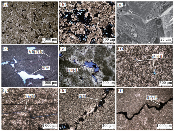 2.2 储集空间类型铸体薄片与扫描电镜观察结果显示,区内洗象池组白云岩储集空间类型以溶蚀孔(洞)(图 3a-3d)为主,同时发育(残余)粒间孔(图 3e)、(残余)晶间孔(图 3f)和微裂缝(图 3g-3i)。