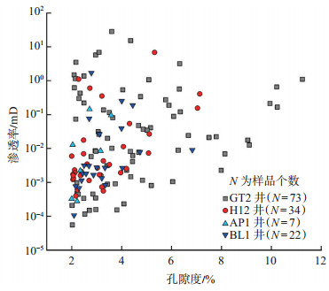 2.3 物性特征川中地区寒武系洗象池组白云岩孔隙度普遍小于10.0%,绝大多数样品孔隙度低于2.0%,本文参考以往的储层划分标准[5, 20-21],将2.0% 作为储层孔隙度的下限。分析结果(图 4)表明,洗象池组白云岩储层孔隙度为2.0%~10.2%,平均孔隙度为3.9%,渗透率为5.60×10-5~28.10 mD,平均渗透率为0.64 mD,总体反映了低-特低孔渗的储层特征。尽管如此,部分样品仍具较好的孔渗物性,以GT2井洗二1段储层为例,其平均孔隙度为4.5%,且孔隙度大于6.0% 的样品占比超过20%,说明在整体致密的背景下仍可发育一定的优质储层。