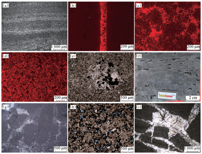下载原图 图 5 川中地区寒武系洗象池组白云岩成岩作用特征 (a)纹层状泥晶白云岩,GT2,5 325.40 m,单偏光;(b)泥晶白云岩,微裂缝被方解石充填,脉体发强橘红色光,AP1,4 453.95 m,阴极发光;(c)粗粉晶白云岩,具颗粒幻影,残余颗粒发暗红色光,粒间白云石发强橘红色光,BL1,4 622.90 m,阴极发光;(d)粗粉晶白云岩,晶粒边缘发强橘红色光,GT2,5 336.82 m,阴极发光;(e)粉晶含粉砂云岩,见鸟眼孔充填白云石与黄铁矿,夹少量粉砂,BL1,4 621.20 m,正交偏光;(f)砂屑白云岩,准层状溶蚀孔洞发育,GT2,5 343.37~5 343.54 m;(g)古岩溶角砾岩,岩溶角砾间夹陆源粉砂,局部被白云石充填,GS26,4 323.40 m,单偏光;(h)细晶白云岩,见晶间溶孔,孔边缘残留沥青,GT2,5 321.46 m,单偏光;(i)构造角砾白云岩,局部因构造破裂形成构造角砾,被后期白云石胶结,NC7,5 029.73 m,单偏光 Fig. 5 Diagenesis characteristics of dolomites of Cambrian Xixiangchi Formation in central Sichuan Basin |