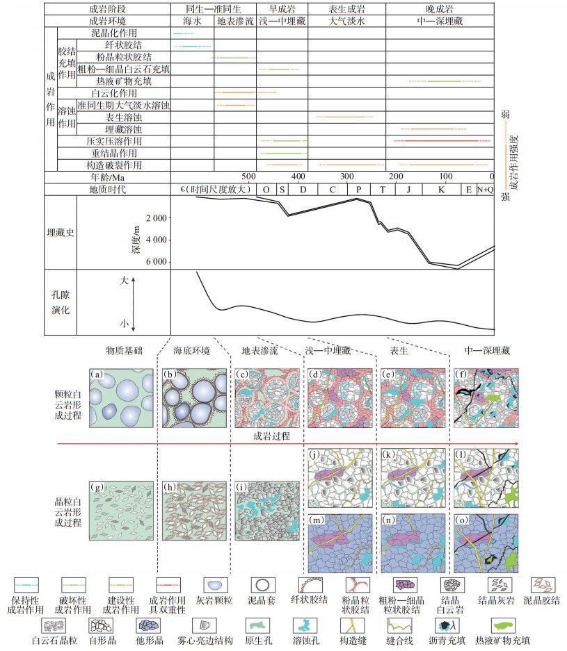 4 成岩序列与孔隙演化洗象池组白云岩储层的孔隙演化与成岩演化密切相关,根据川中地区寒武系洗象池组白云岩储层成岩作用特征,总结出该区洗象池组颗粒白云岩(图 6a-6f)与晶粒白云岩(图 6g-6o)成岩演化经历了海水、大气淡水和埋藏成岩作用,成岩阶段可划分为同生-准同生阶段、早成岩阶段、表生成岩阶段和晚成岩阶段4个阶段。