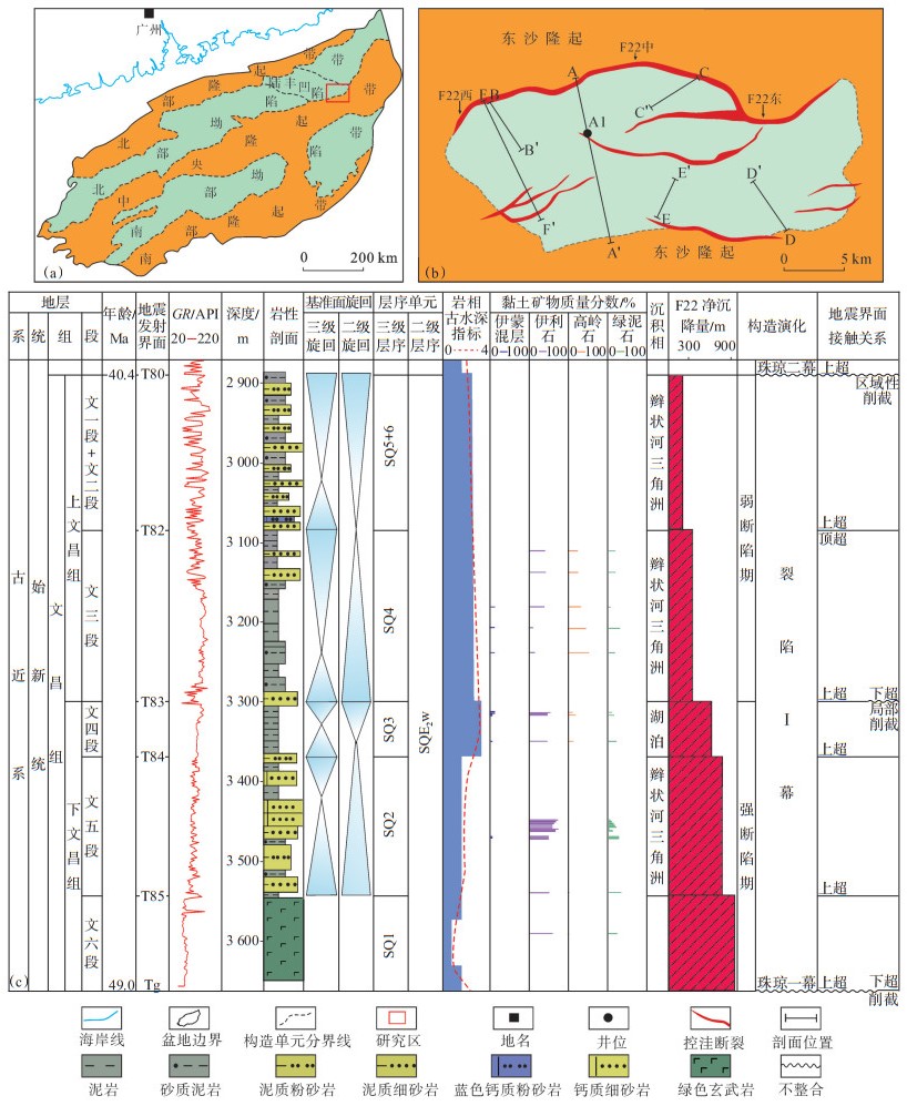 1 地质概况珠江口盆地是在被动大陆边缘发育起来的新生代裂陷盆地[15],经历了先断后坳的构造演化过程[16],由北向南分为5个构造单元,分别是北部隆起带、北部坳陷带、中央隆起带、南部坳陷带和南部隆起带。陆丰凹陷位于珠江口盆地北部隆起带东部(图 1a),面积为7 760 km2,发育多个次级洼陷,其中陆丰13洼和陆丰15洼为已证实的富烃洼陷[11]。研究区陆丰22洼位于陆丰凹陷最南部,勘探程度较低(图 1b)。珠江口盆地的构造演化经历了裂陷、坳陷和块断活化3个阶段[10],在新生代经历珠琼一幕和珠琼二幕等大型构造运动(地震标志层分别为Tg和T80),其中珠琼一幕到珠琼二幕为早期裂陷Ⅰ幕,文昌组由老到新经历了强断陷期和弱断陷期2个构造演化阶段。珠江口盆地自下而上发育了神狐组、文昌组、恩平组、珠海组、珠江组、韩江组、粤海组和万山组[11, 14],由于陆丰凹陷缺失神狐组,文昌组形成于强裂陷期,不整合或假整合于前古近系基底上。研究区文昌组岩性以厚层灰色泥岩为主,早期发育部分绿色玄武岩和砂岩,顶部为灰色泥岩夹砂岩(图 1c)。