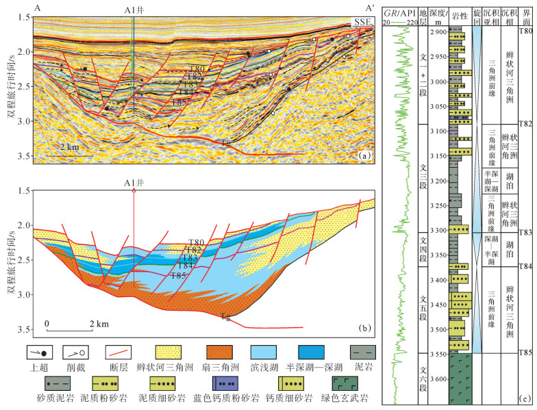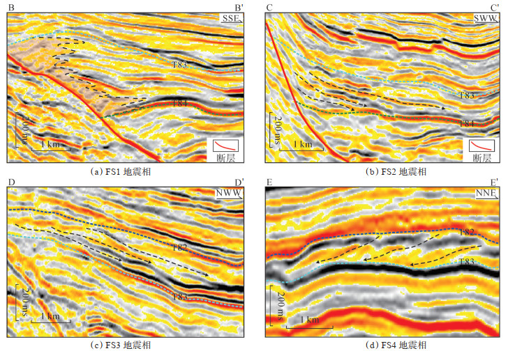T85,T84,T83和T82是研究区文昌组内部的4个三级层序界面,常受次级构造作用的影响[17],不整合范围有限,在地震剖面上表现为中—强振幅和较好的连续性,并存在上超和削截现象(图 2a),同时界面上下地震相存在差异。文昌组内部T85界面之上存在上超现象,界面之下可见局部削截,地震相特征为弱—中振幅、低频、中连续性反射。T84界面可见上超现象,局部有不整合接触,GR测井曲线从漏斗形和高幅度箱形变为低幅度平直状,岩性由大段砂岩转变为整段泥岩。T83界面之上可见上超,有不整合接触,存在削截现象,在地震剖面上表现为中—强振幅、较为连续的反射特征。T82界面之上可见上超,界面之下存在顶超,从测井岩性资料上(图 2c)可以看出,界面之下为薄层砂泥互层,界面之上为厚层砂岩夹蓝色钙质粉砂岩和灰色泥岩,差异明显。