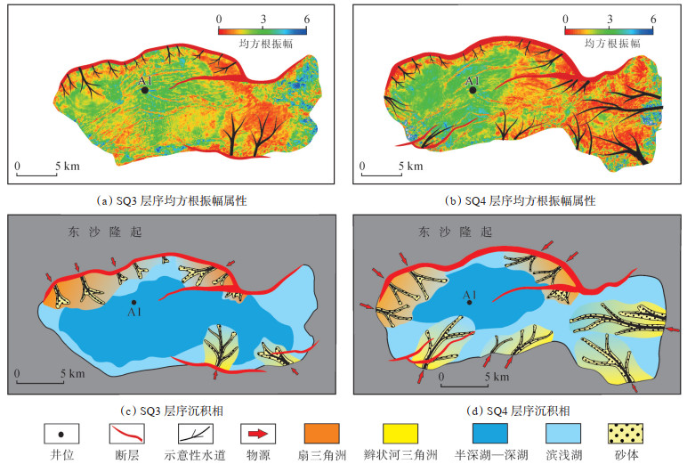 总体来说,SQ3和SQ4层序沉积体系具有明显差异。SQ3层序沉积期,A/S >1,洼陷北部陡坡发育近岸扇三角洲体系,东部和东南部缓坡地区发育辫状河三角洲体系,中心及南部地区以湖相沉积为主,发育大面积半深湖—深湖沉积。SQ4层序沉积期,洼陷边界断层活动性减小,A/S ≤ 1,洼陷北部扇三角洲范围向物源区缩小,南部和东部地区辫状河三角洲沉积体系发育规模增大,半深湖—深湖面积大幅度减小,滨浅湖体系广泛发育。