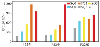 3.3.1 构造形态与充填特征差异SQ3层序沉积期,陆丰22洼整体处于强断陷期。对3处控洼断层F22西、F22中和F22东各时期净沉降量的统计结果(图 5)表明,该时期控洼断层活动强度大,洼陷形成较大的可容空间,来自北部东沙隆起的物源在洼陷北部陡坡带形成大套近岸扇三角洲体系,该时期A/S > 1。地层整体呈楔状减薄,受断裂控制,向断裂方向增厚,表明为断裂活动与沉积过程同时发生的断陷沉积层。洼陷边缘沉积体呈下超前积充填特征,以发育FS1和FS2地震相为主,表现为中—强振幅、低频、连续性好的反射特征,局部表现为杂乱反射,且前积迁移轨迹具有向洼陷边缘、向上迁移的特征。SQ4层序沉积期,洼陷整体处于弱断陷期,断层活动减弱,可容空间较小,北部物源形成扇三角洲体系向前推进,南部和东部缓坡带形成延伸距离远、覆盖范围广的辫状河三角洲体系,该时期A/S ≤ 1。地层从北部断层根部到南部有减薄趋势,但整体与SQ3层序地层相比,地层厚度大幅减小,表明为弱断陷期阶段的沉积层。洼陷沉积体呈下超和斜交前积充填特征,以发育FS2和FS3地震相为主,表现为中弱振幅、中—高频率、低连续的反射特征,且前积迁移轨迹具有向洼陷内部、向水平或向下迁移的特征。
